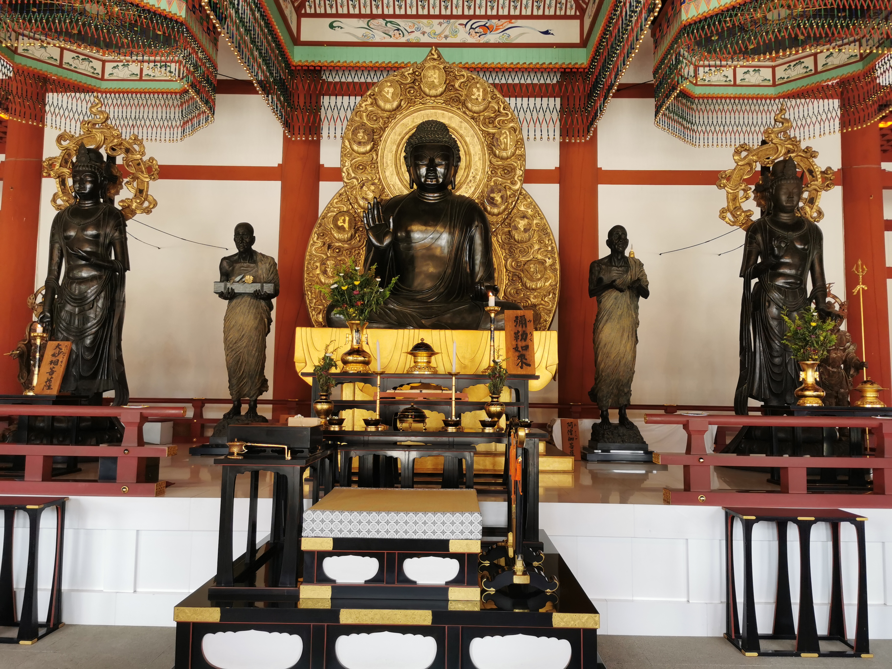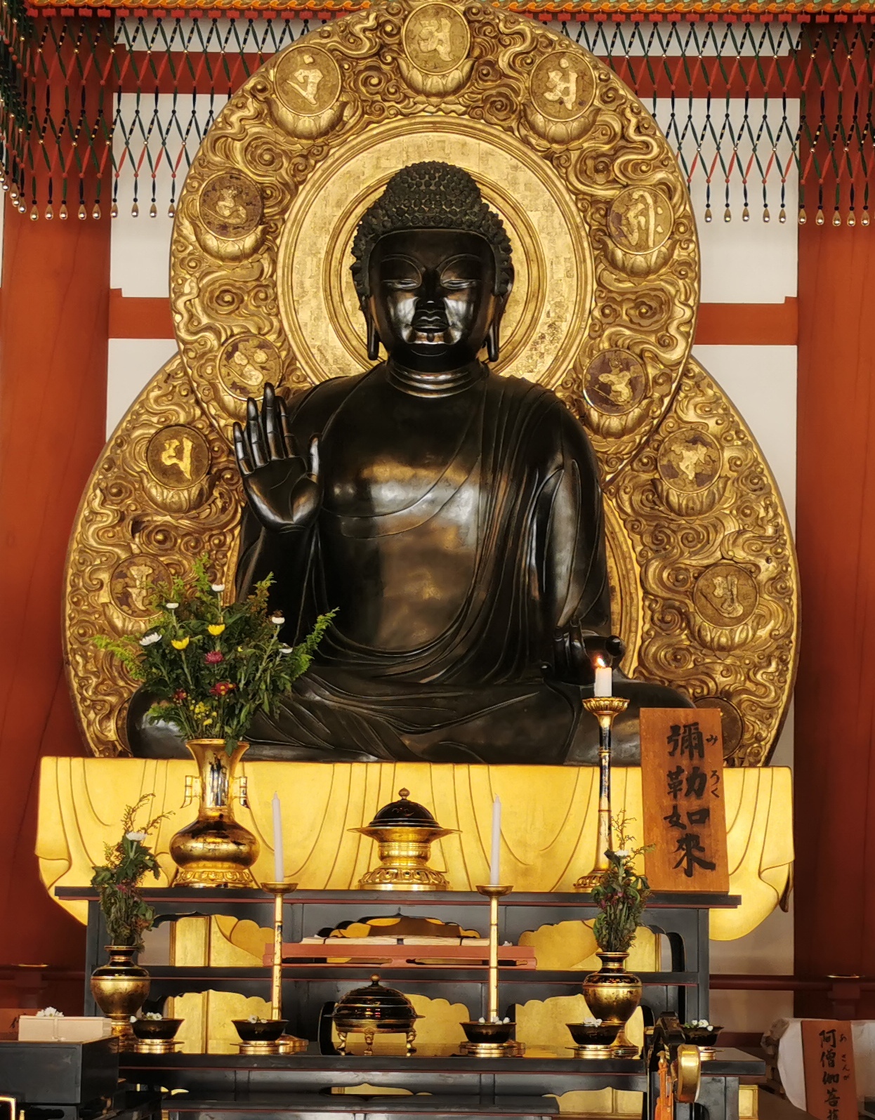 à l'est, entouré de deux bodhisattvas liés au monde des astres. Il a fait vœu