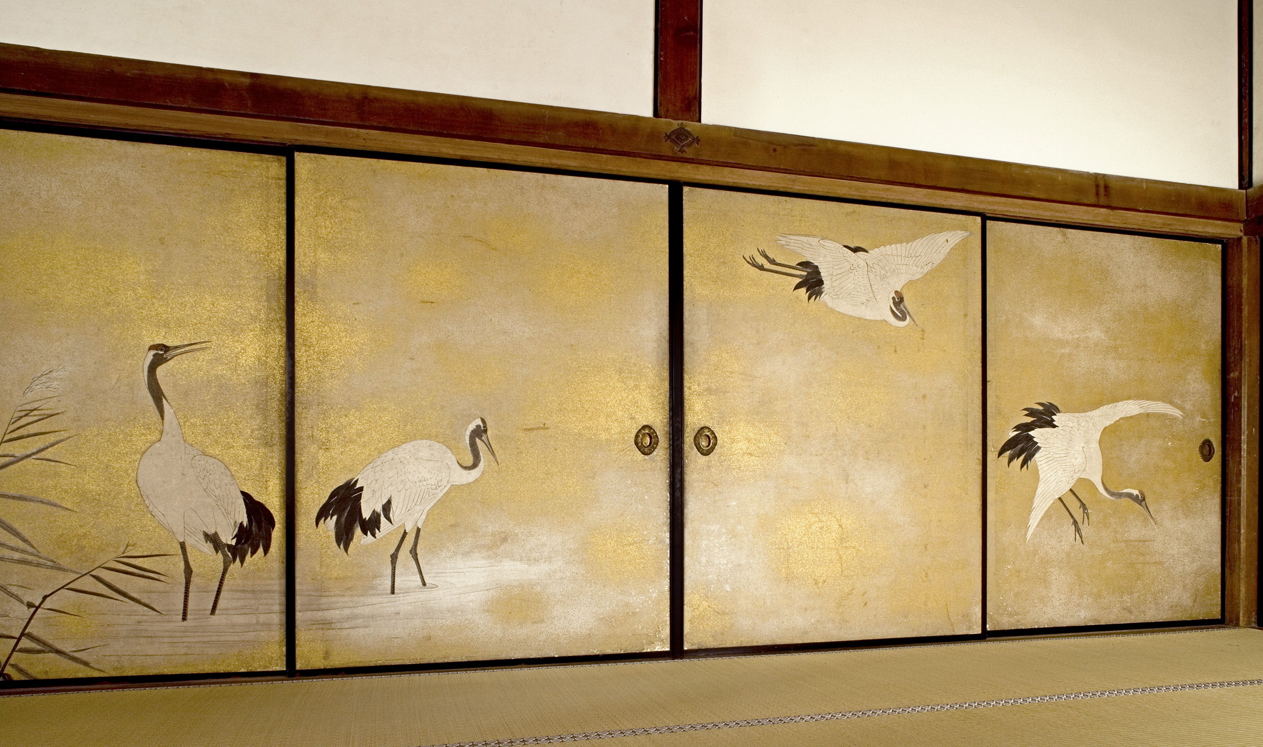 On y admire les peintures « fusuma-e » de deux variétés de grues ;