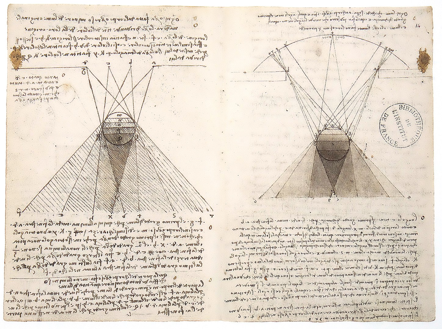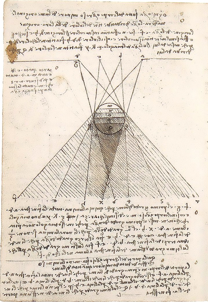 L'étude de la lumière et la maîtrise de son rendu sont parmi les grands sujets qu'aborde Léonard dans ses recherches picturales. C'est, pour lui, un moyen d'atteindre la parfaite retranscription de la nature et de donner une impression de mouvement. Après ses premières études de draperies qu'il mène déjà à l'atelier de Verrocchio, Léonard éprouve le besoin d'étudier les théories consacrées à l'optique. Il écrit dans ses notes ses expériences sur l'ombre et la lumière et les dessins qu'il y adjoint illustrent comment les ombres, directes et indirectes, se forment sur des corps opaques.