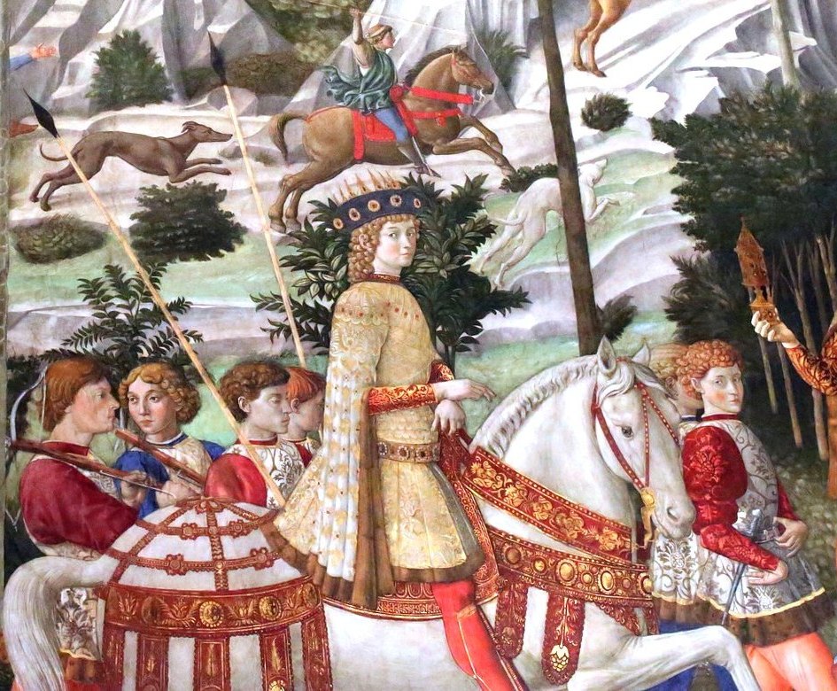 harnaché. Derrière lui, montés à cheval, suivent Pierre de Médicis, son père,