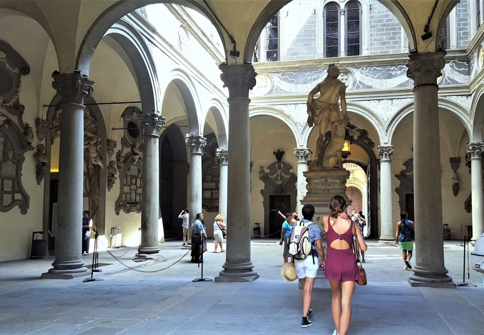 Le palais Medici-Riccardi à Florence, de style Renaissance, a été construit par Michelozzo pour Cosme de Médicis entre 1444 et 1459. Ses façades à bossage rustique, dont les trois niveaux typiques décroissants en allègent l'allure et accroissent l'effet perspectif, sont séparées par des corniches marcapiano et l'ensemble est couronné d'une corniche en surplomb à modillons de type corinthien. La cour ouverte à péristyle est d'inspiration romaine.