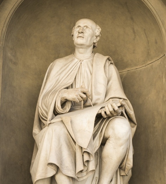 Filippo Brunelleschi, né en 1377 à Florence et décédé en 1446 à Rome, est un architecte, sculpteur, peintre, et orfèvre de l'école florentine. Il a étudié l'apparence des objets à mesure qu'ils apparaissaient de plus en plus loin. Ses études sur la perspective linéaire comprenaient des dessins et des peintures du baptistère de Florence et du Palazzo Vecchio. En 1415, Brunelleschi théorise à Florence la « perspective mathématique ».