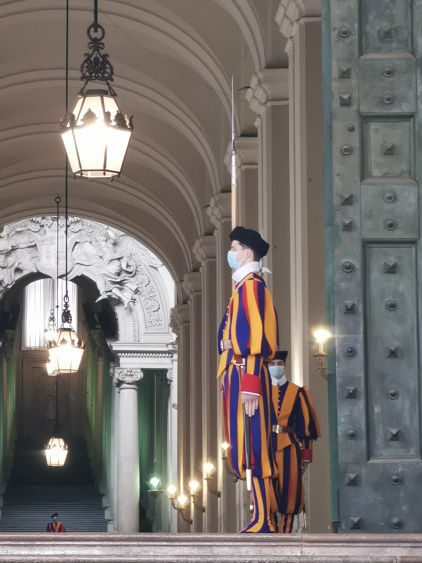 L'uniforme des gardes suisses est devenu une tradition vaticane. Jabot blanc, manches amples et pantalons bouffants, le tout dans un motif rayé à larges bandes bleu nuit et jaune canari.