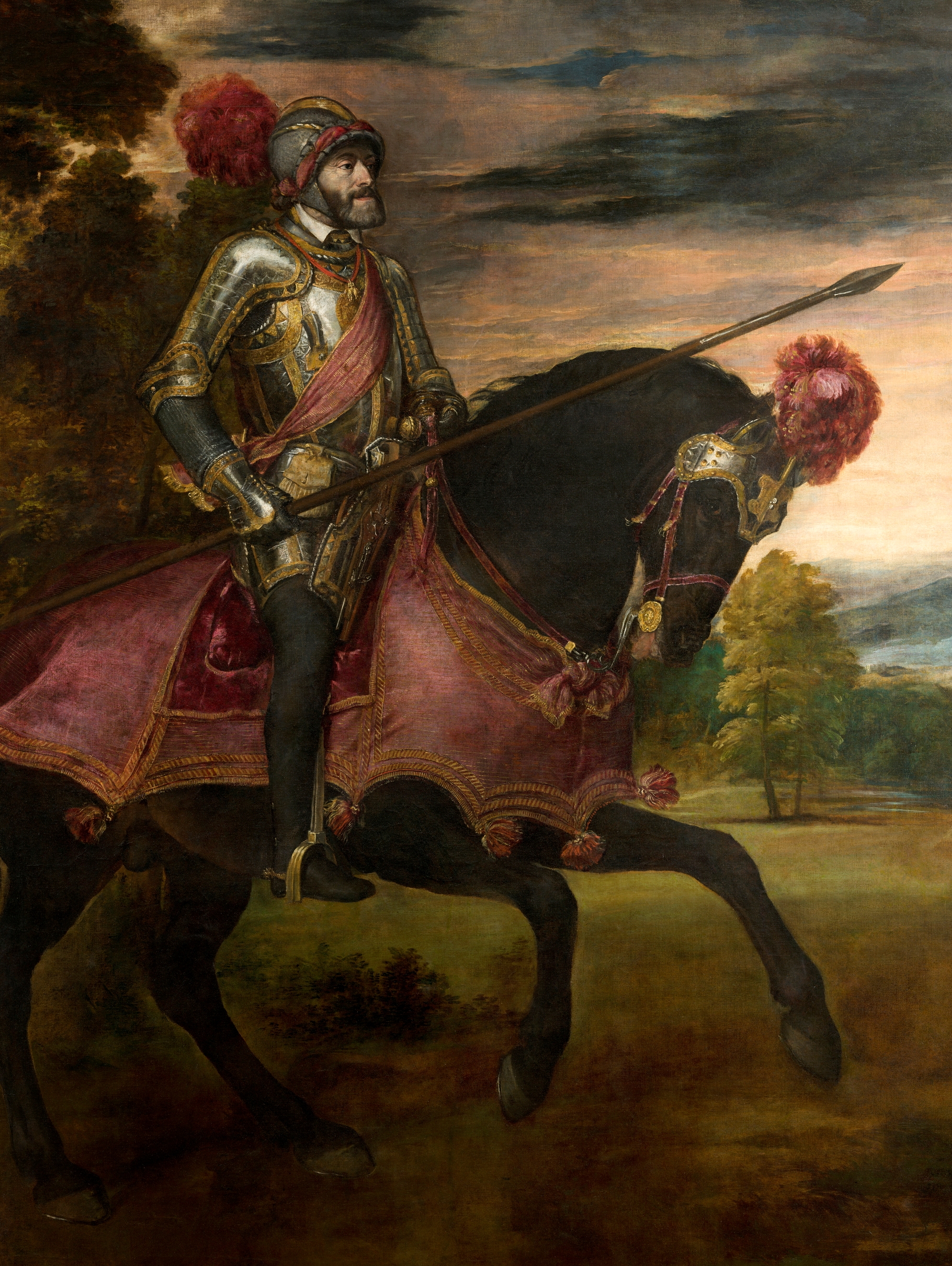 Dans ce portrait équestre, l’empereur est dépeint sous les traits d’un « soldat du Christ » qui prend la défense de la chrétienté attaquée de l’intérieur par le protestantisme. La peinture ne cherche pas à mettre en évidence la défaite militaire adverse, et les paysages en fond sont placides, sans troupe, ni représentation des ennemis défaits.